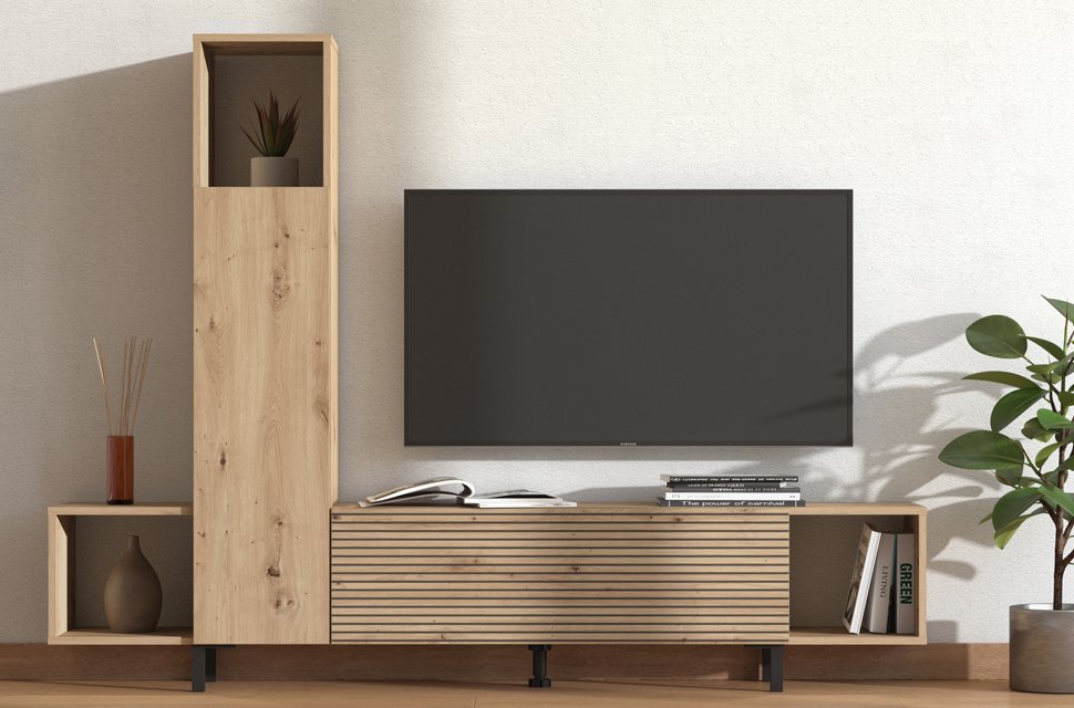Entertainment center ANDROS, in combination of artisan oak decor and artisan oak with stripes, is a modern and functional solution for decorating the living room. Compact and clean in design, the entertainment center ANDROS allows you to conveniently equip the space thanks to open and closed storage shelves, as well as the surface intended for the TV up to 50". Thanks to the well-designed layout of the usable space, the entertainment center easily fits into modern home environments.