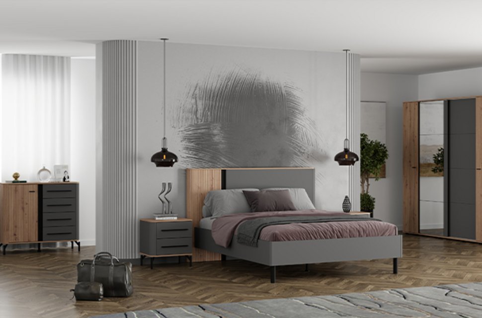 Bedroom SINOP is a modern, functional and carefully designed solution for styling the bedroom space. The complex combination of artisan oak decor, artisan oak foil, graphite gray decor and black wood decor creates a sophisticated balance between warm and cold tones, bringing dynamics, visual contrast and a clearly defined geometric line of elements into the space.