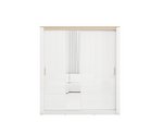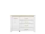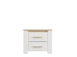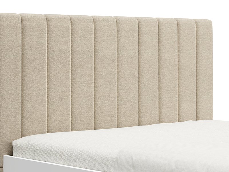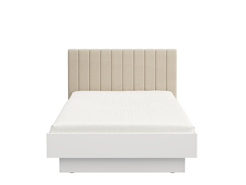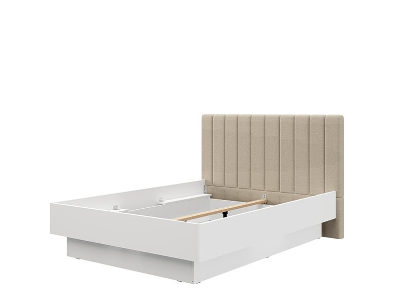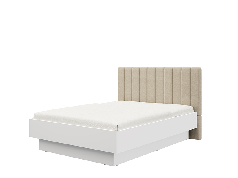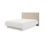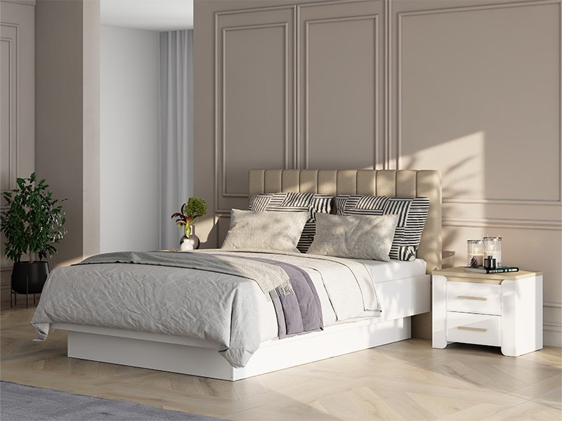 "Double bed ABERDEEN 160, made in a combination of opaque white color with a beige upholstered headboard, contributes to the modern and elegant look of the bedroom, emphasizing the contrast of the material and a clearly defined geometric design line.