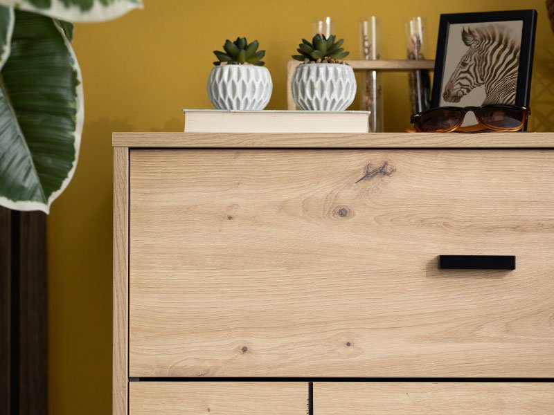The ALERIA 80 3F cabinet, in artisan oak decor with a printed design, contributes to the practical arrangement of the bedroom. Its attractive design, highlighted by black stripes on the wood decor, along with matching black handles and legs, brings a modern style to the bedroom interior.