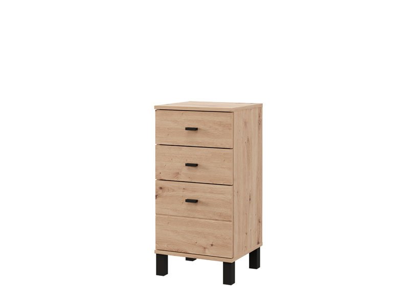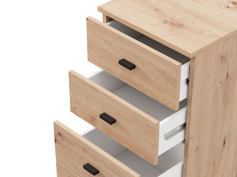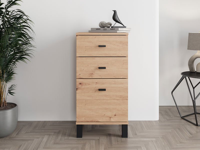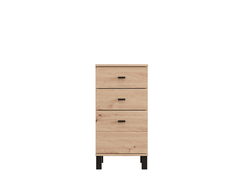 Cabinet ALMOND 38 3F, in artisan oak decor, is a narrower model that brings warmth and a pleasant atmosphere to the space, with a functional usable space through three drawers, one of which is deeper. It is ideal as an additional piece of furniture in the hall, living room, bedroom or children's room, where it combines the practicality and warmth of the interior.