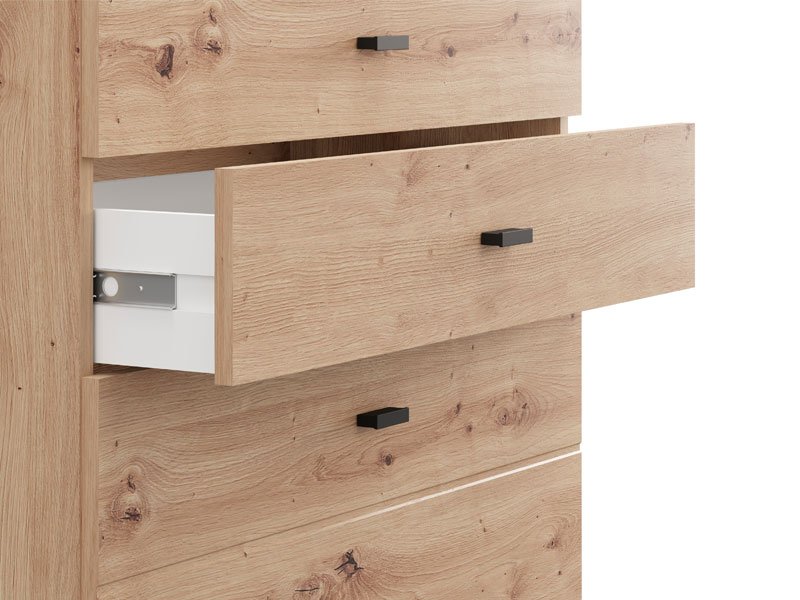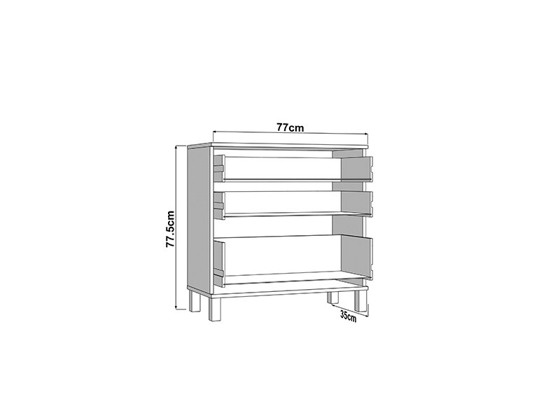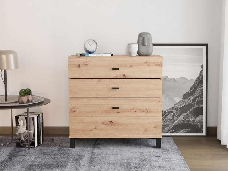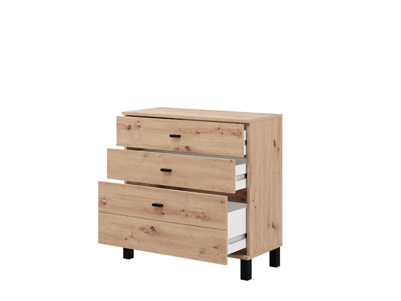 Cabinet ALMOND 77 3F, in artisan oak decor, brings warmth and a pleasant atmosphere to the space, with a simple and functional design. The use space consists of three drawers, one of which is deeper, intended for the disposal of larger items, while the remaining two are suitable for smaller items. Thanks to its compact dimensions and neutral aesthetics of wood decor, cabinet ALMOND 77 3F is a practical solution for equipping a bedroom, hall or smaller living area.