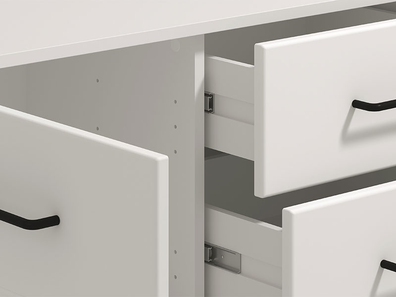 The well-arranged usable space of this cabinet consists of three closed partitions and four practical drawers.