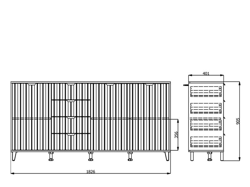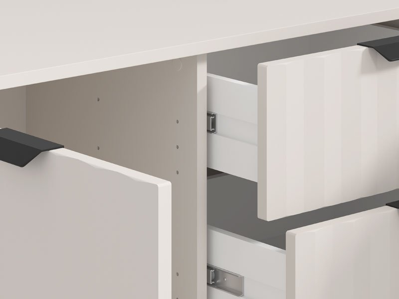 The well-arranged usable space of this cabinet consists of three closed partitions and four practical drawers.