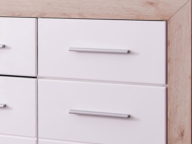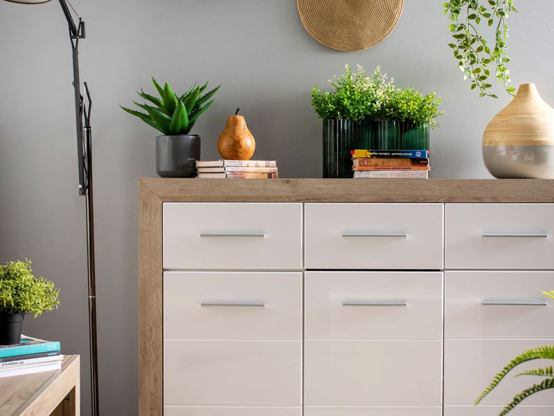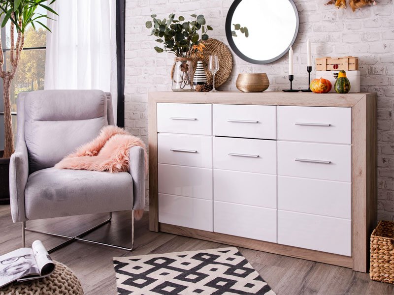 ETNA 3K3F cabinet, with a combination of gray oak décor and fronts coated with white lacquer foil, has three practical segments with dividing shelves and three drawers. Due to its design, ETNA 3K3F cabinet is compatible with different models of furniture intended for furnishing the living room, the bedroom or the hallway.