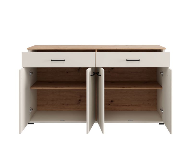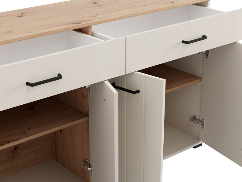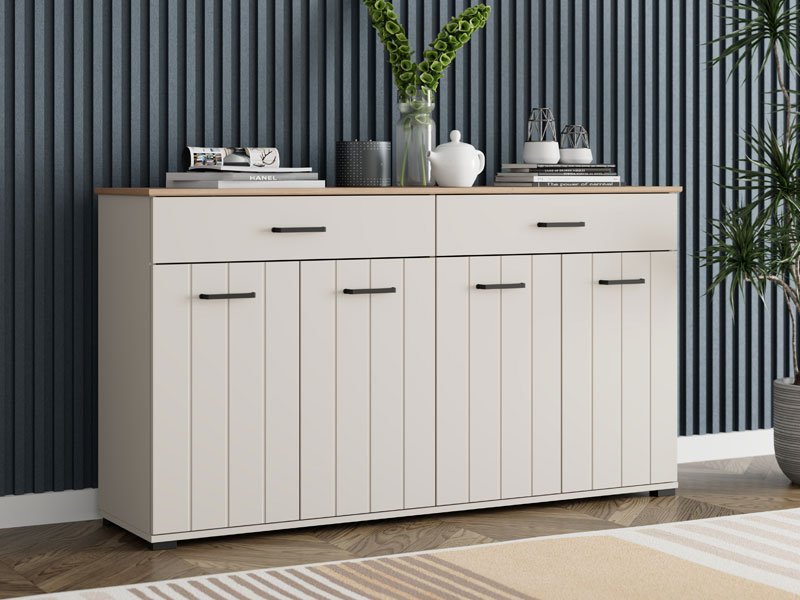TV shelf LAMBETH TV 156 4K2F4V in a combination of cashmere decor and artisan oak brings warmth and rustic character to the space, thanks to a special finish in the form of stripes embossed on the fronts. The usable space consists of four closed partitions and two spacious drawers, which enable practical and organized disposal of various items, from documentation and trinkets to decorative details. Cabinet LAMBETH 156 4K2F4V is part of the system of elements LAMBETH, which is characterized by aesthetically pronounced style and functionality.