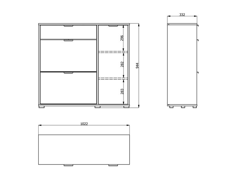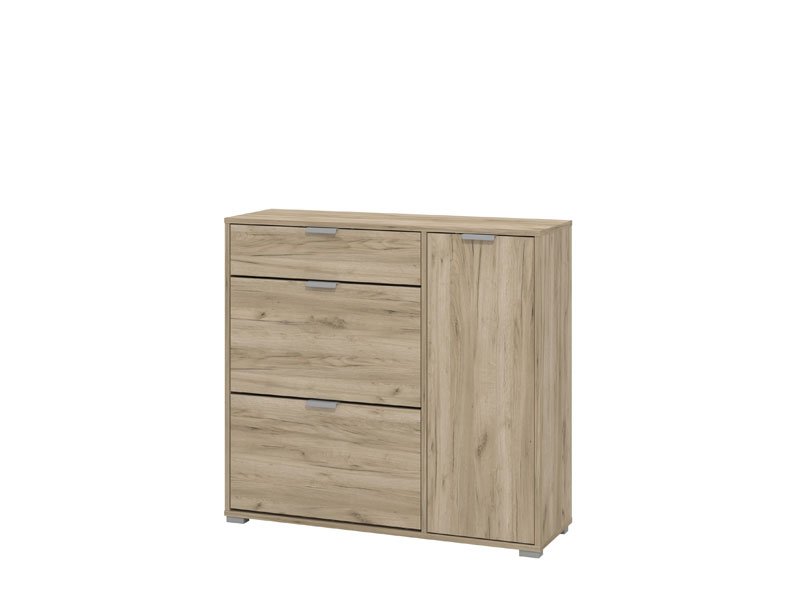 Shoe cabinet ARCO 2 is an ideal solution for fitting into spaces of different sizes. This design has two segments for storing shoes, practical drawer and a part with two shelves located to the right.