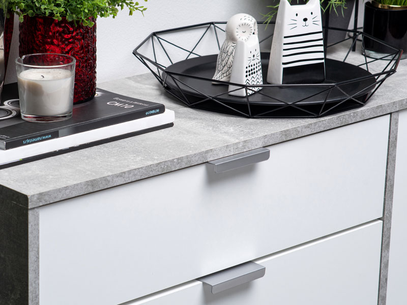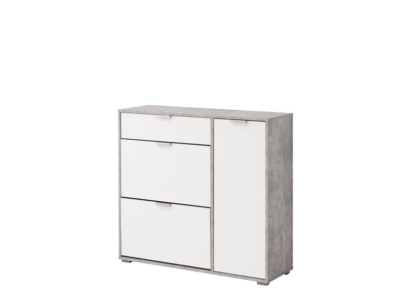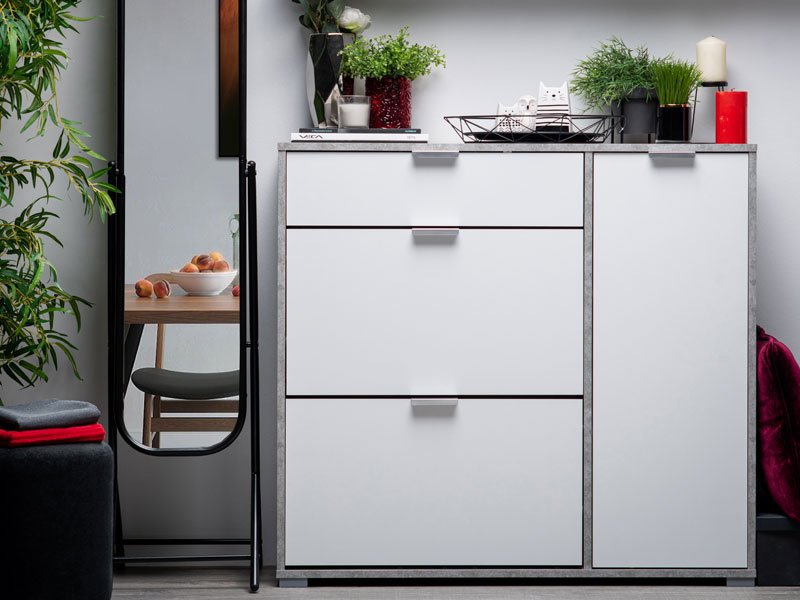 Shoe cabinet ARCO 2 in opaque white is the ideal solution for fitting into small spaces. This model has two footwear storage segments, a practical drawer and a segment with two shelves positioned on the right.