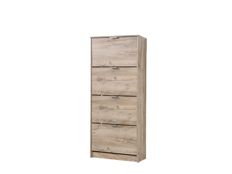 Shoe cabinet HUGO 24, with its grey oak pattern, has four segments in which you can keep your seasonal footwear, and thanks to its dimensions and two sets of shelves, it is a very effective functional solution for decorating your hallway of more modest dimensions.