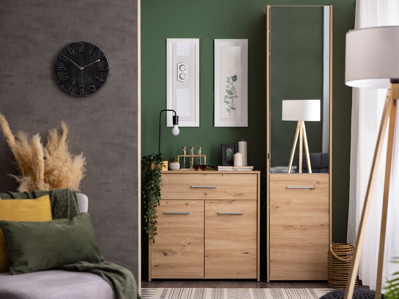 Shoe cabinet MENORICA 1K OG, in artisan oak decor is enriched with a practical mirror in the upper part of the element. Inside, there are closed shelves for storing shoes, which provide the possibility of rational organization of the hall unit.