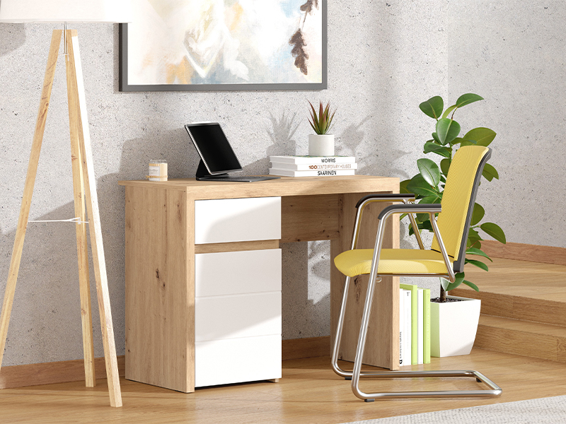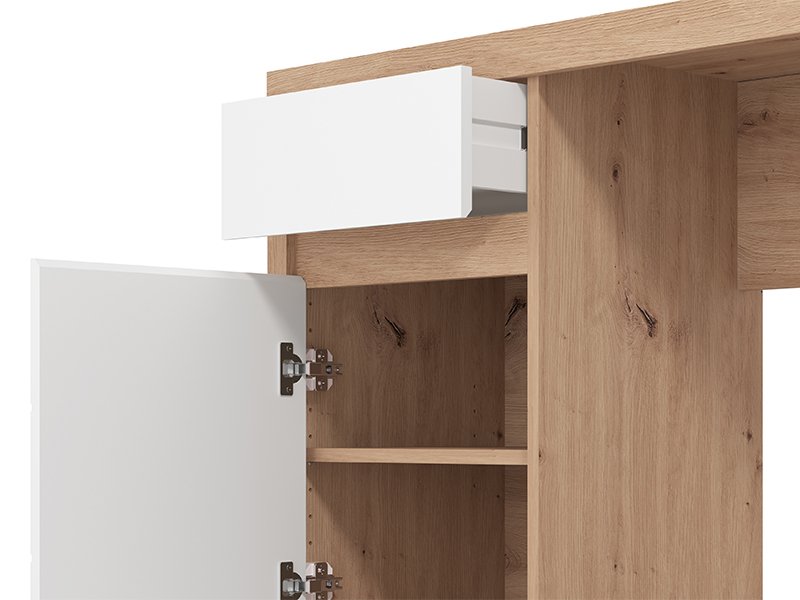 The computer desk DIOFANT 1F1V LP, in a combination of artisan oak, opaque white and artisan oak foil, features a modern and elegant design with fronts without handles. The usable area consists of one closed partition part and one drawer, which enable a clear and practical disposal. Thanks to its functional organization and aesthetically aligned decor, the computer desk DIOFANT 1F1V LP is an indispensable element for the decoration of the workspace.