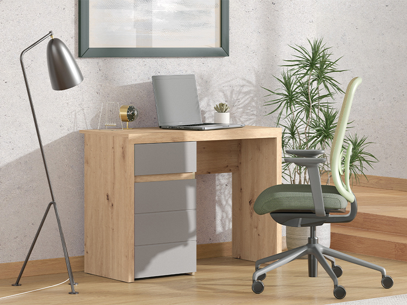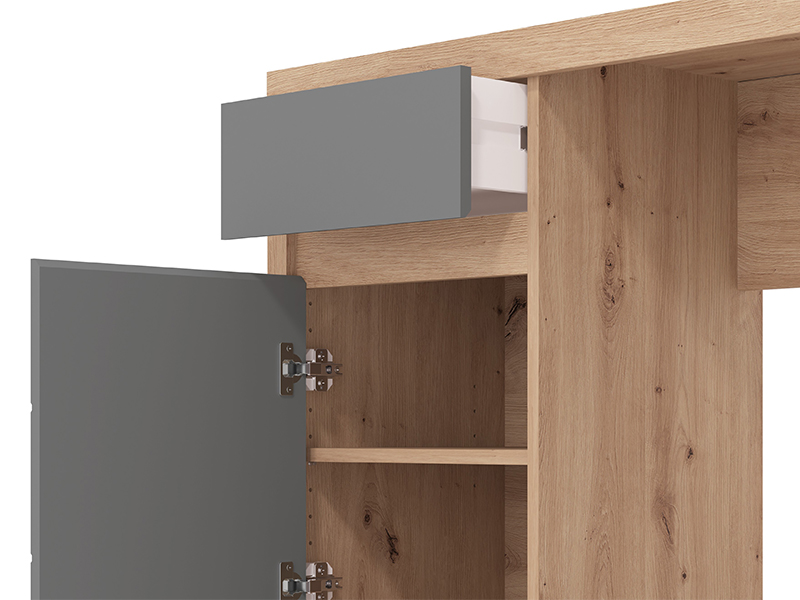 The computer desk DIOFANT 1F1V LP is made in a combination of artisan oak decor, graphite gray decor and artisan oak foil, characterized by a modern and elegant design with fronts without handles. The usable area consists of one closed partition part and one drawer, which enable a clear and practical disposal. Thanks to its functional organization and aesthetically aligned decor, the computer desk DIOFANT 1F1V LP is an indispensable element for the decoration of the workspace.