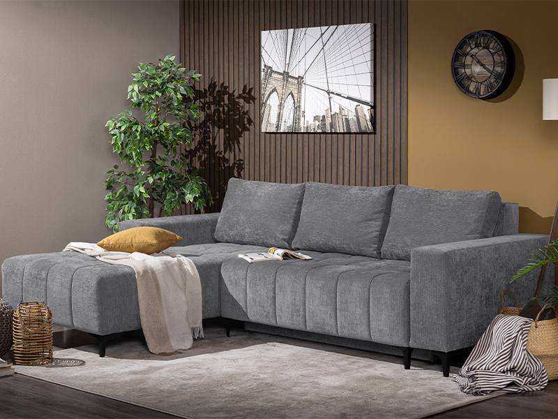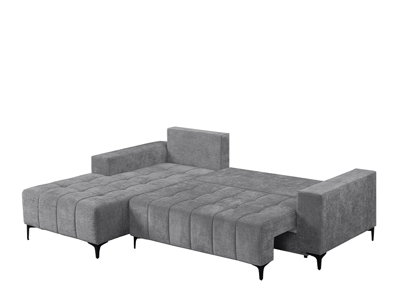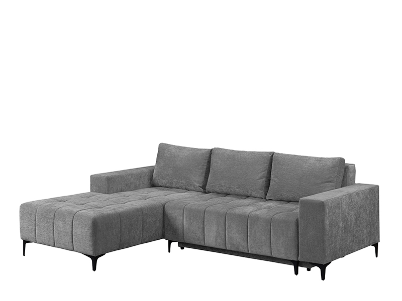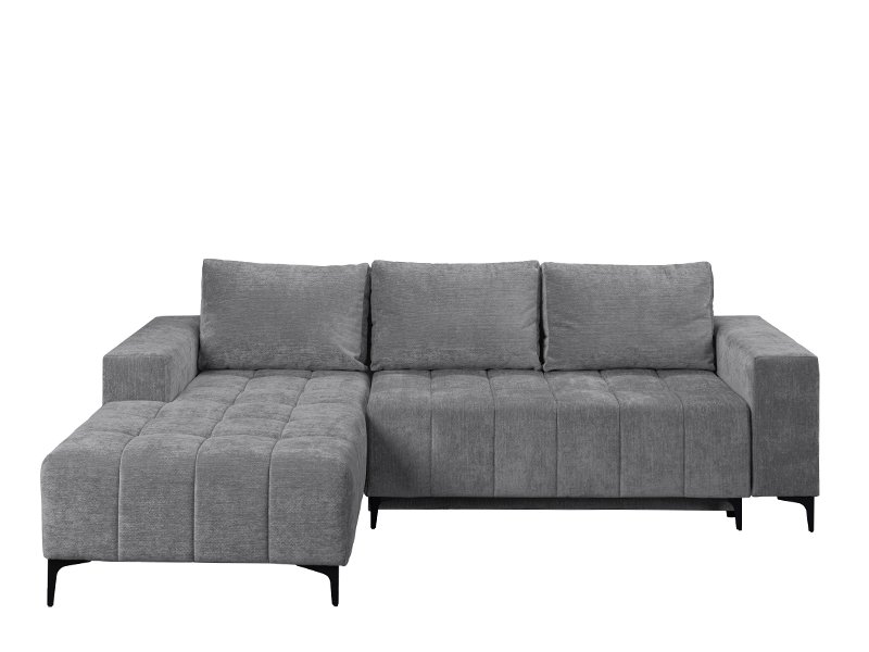 The exact name of the pattern is: textile VIBE 95 gray, corner left. Corner sofa bed BOGOTA features a modern and elegant design, ideal for a modernly decorated living area. With a practical backrest tilting system, it is easily transformed into a bed with a sleeping surface measuring 134x200 cm. It is made of a sponge, providing a good level of comfort in everyday use. The corner sofa bed has one storage box, suitable for storing linens or other necessary items.