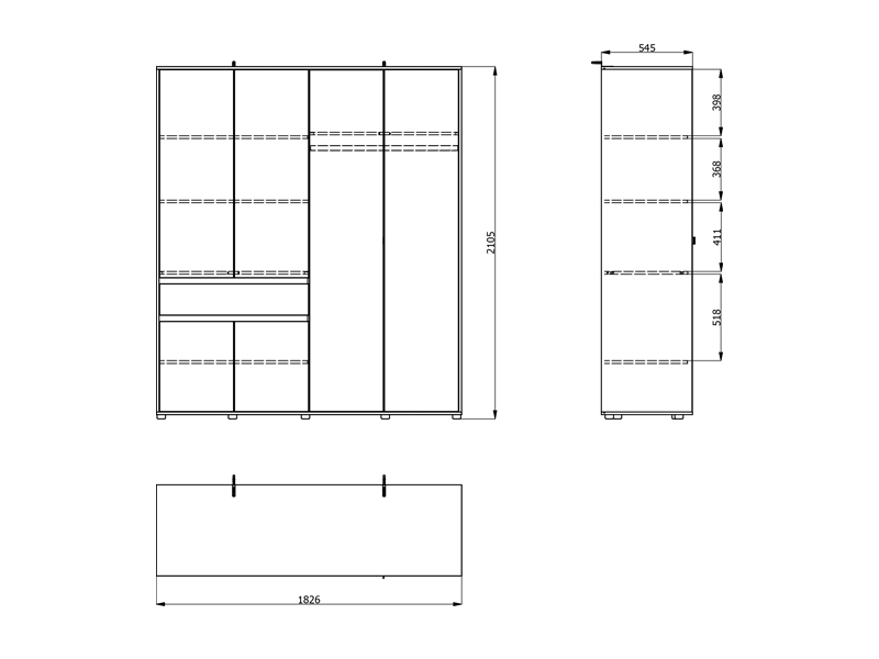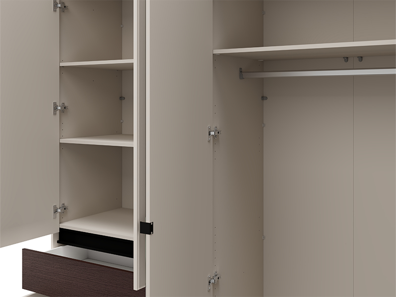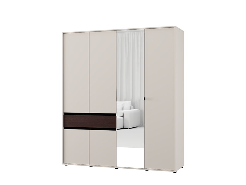 This four-winged cupboard is equipped in part with a wardrobe bar, closed partition and one drawer, while one front has a mirror, which further improves functionality and visually expands the space.