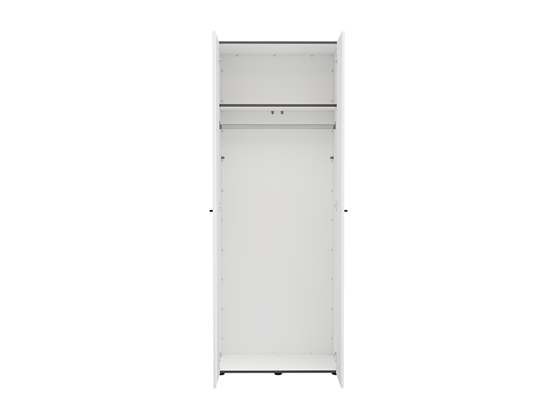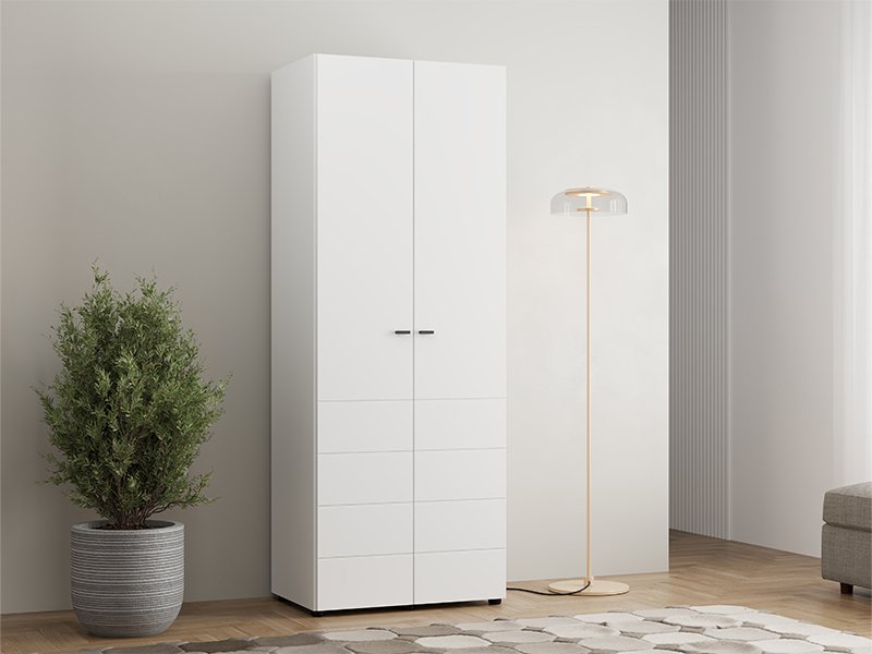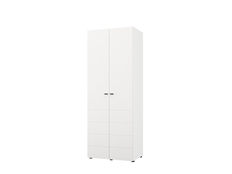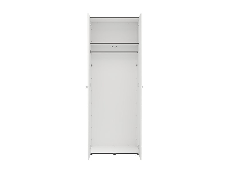 Wardrobe NEVIS 2K h207, in an opaque white decor, offers a functional wardrobe storage solution. It is equipped with a practical usable space with a wardrobe rail which allows for a neat organization of clothing. Thanks to its simple design and neutral appearance, it fits easily into different interiors. It belongs to the NEVIS collection of wardrobe and can be combined with other models from the same line.