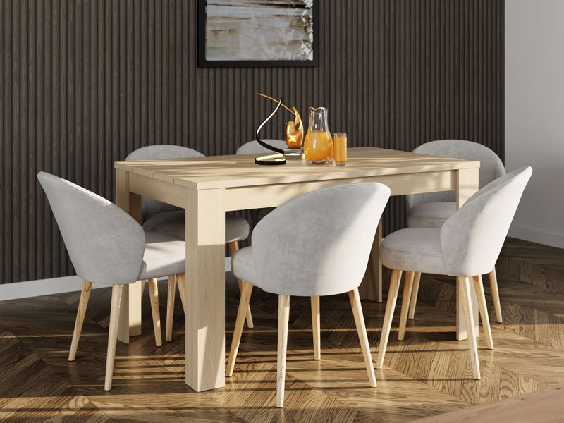 Dining table SPOLETO 135x80, made in light port oak decor, is an excellent choice for contemporary dining rooms. Clear lines and minimalist design make this dining table modern and functional, while the dimensions of 135x80 cm allow comfortable use during meals. With its design and subtle, warm decor of light port oak, it brings a pleasant and contemporary look to your dining room, easily combining with different styles of chairs.