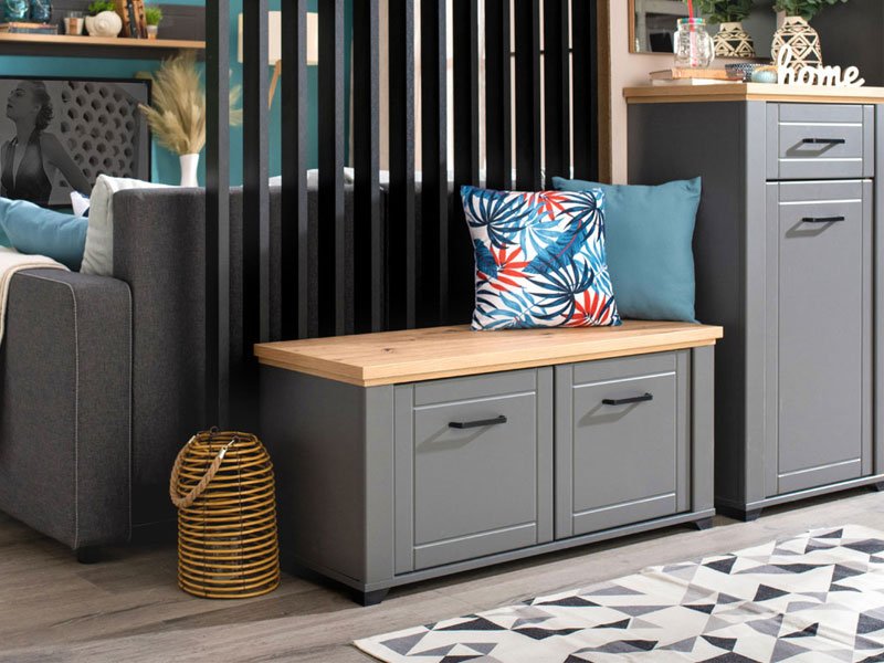 Hall unit element VALENCIA KOM in combination with artisan oak, graphite gray and gray matt foil brings a more subtle, monochromatic touch to the space, which comes through the right design lines. The fronts are enriched with black handles of simple design, which are in line with the design line of the entire collection. It has a practical closed segment for shoe storage. It is part of the eponymous system of elements for furnishing the hall unit ambience, which is characterized by functionality and practicality to which contributes a large number of elements in the system, as well as excellent organization of storage space.