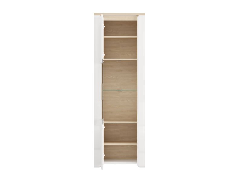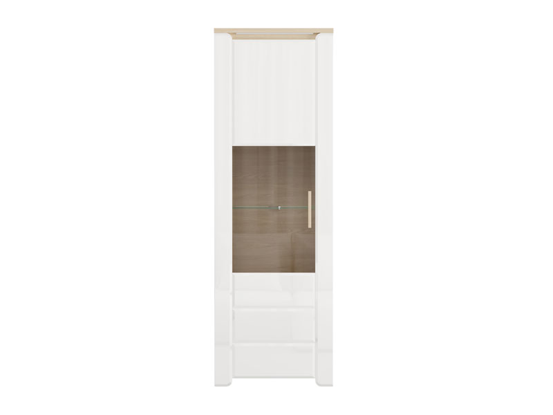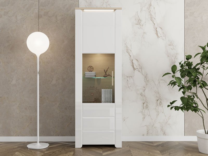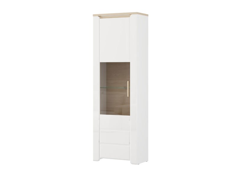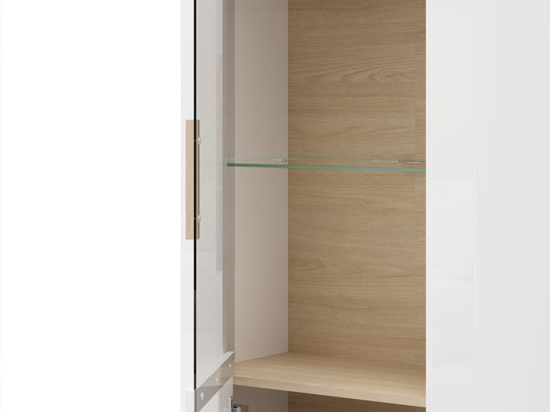 Entertainment center ABERDEEN 1K VS1 194 combines a decor of opaque white, light port oak and white high gloss foil to bring elegance, minimalism and impeccable style to the space. The usable space consists of one closed semi-glazed part, within which there are practical shelves for the organized disposal of various usable and decorative items. The fronts are enriched with discreet handles that follow the design line of the entire collection. Entertainment center ABERDEEN 1K VS1 194 is part of the system of elements ABERDEEN, which features a modern look and functionality. There is the option of adding LED lighting, which visually emphasizes the space and additionally illuminates it.