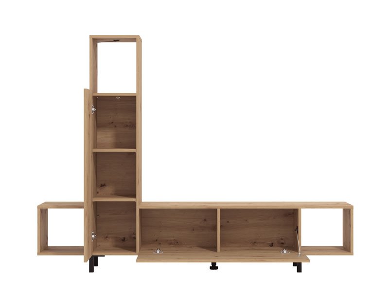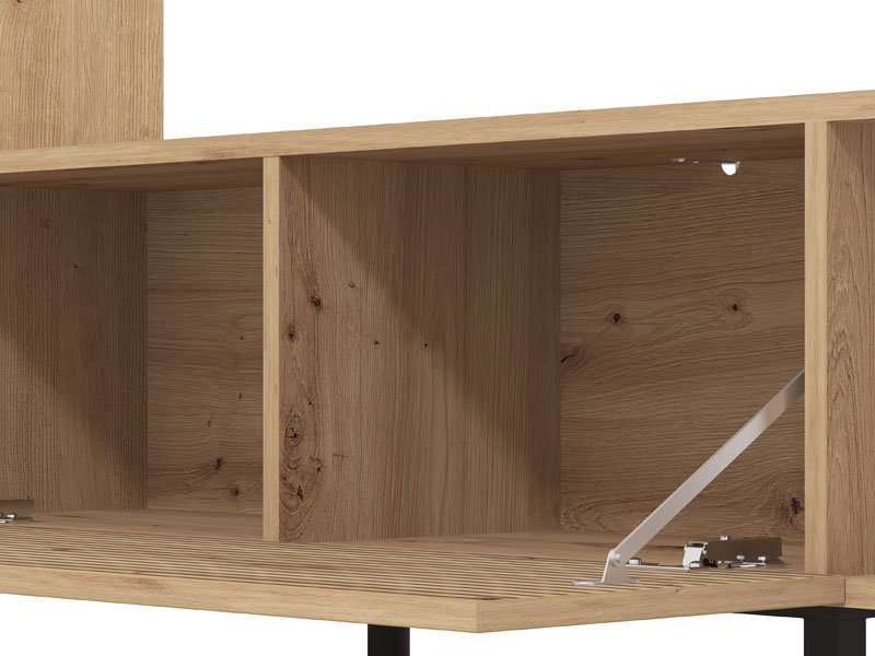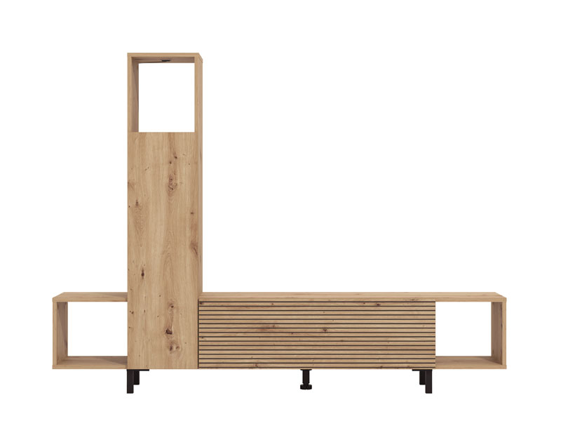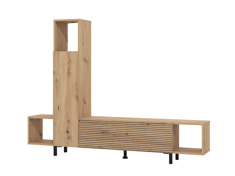 Entertainment center ANDROS, in combination of artisan oak decor and artisan oak with stripes, is a modern and functional solution for decorating the living room. Compact and clean in design, the entertainment center ANDROS allows you to conveniently equip the space thanks to open and closed storage shelves, as well as the surface intended for the TV up to 50". Thanks to the well-designed layout of the usable space, the entertainment center easily fits into modern home environments.