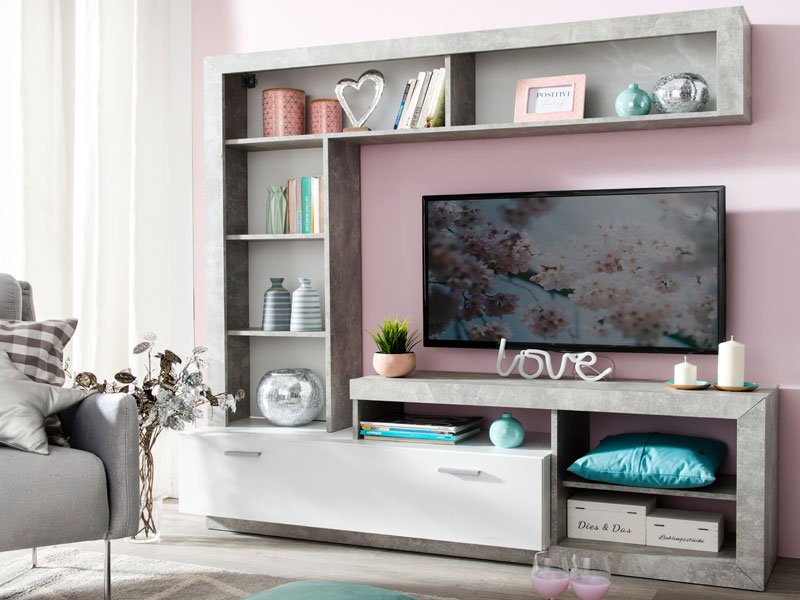 Entertainment center GLEN in combination concrete and opaque white design follows the concordance of form and function as well as a memorable design meant for modern refreshment of the entire living room. Closed section, centrally positioned TV shelf and open sections form a compact whole for keeping all your mementos and audio-visual tech.