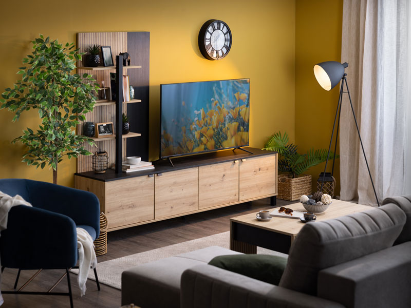 The MARGATE entertainment center, combining artisan oak, black oak, and striped artisan oak finishes, offers a modern and functional solution for living room design. It features three open shelves and four shelves in a closed partitioned section. Thanks to its well-organized storage space and design, it will easily fit into contemporary home interiors.