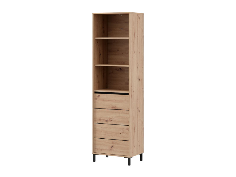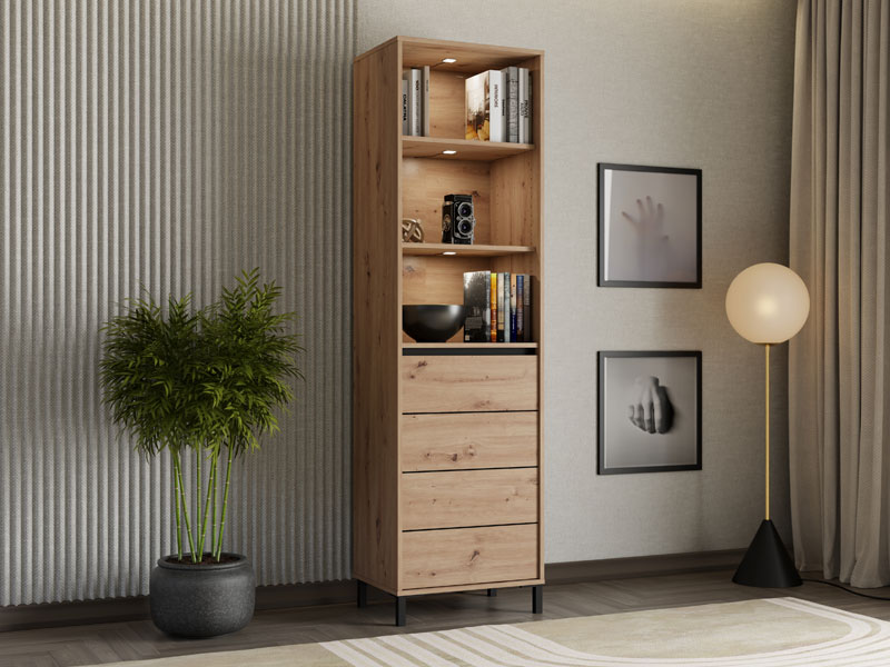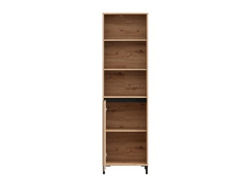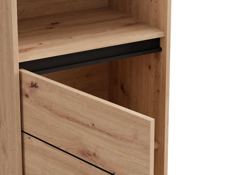 Showcase MARRON 1K1V POP 193 combines artisan oak decor and black matte foil to bring natural warmth and contemporary visual contrast to the space. The usable space consists of one closed partition and three open shelves, which enable practical and organized disposal of decorative items, books and other trinkets. The entertainment center MARRON 1K1V POP 193 is part of the system of elements MARRON, which is characterized by the harmony of rustic tones and the functionality of modern design. There is an option of installing additional LED lighting, which further emphasizes and illuminates the space.