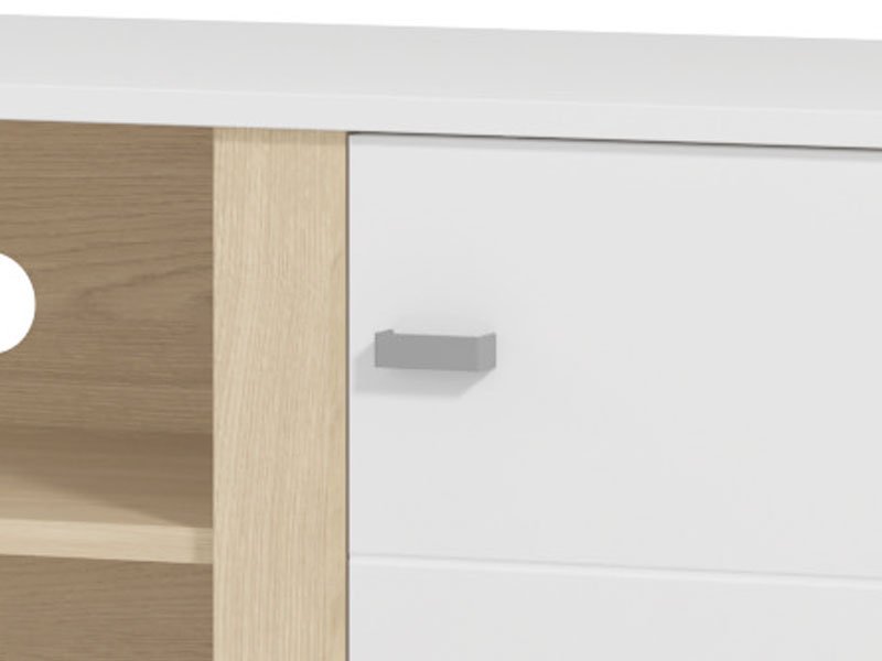 The PECHAM entertainment center, combining an opaque white finish and light harbor oak foil, presents an attractive, modern, and functional solution for living room design. It consists of four sections — two semi-glass cabinets, a TV shelf, and a wall shelf. In addition to closed compartments, the TV shelf also features two open shelves suitable for audio-visual equipment. Its well-organized storage space makes this entertainment center an excellent choice for contemporary homes while enhancing the overall aesthetic of the living room. There is the option of adding lighting.