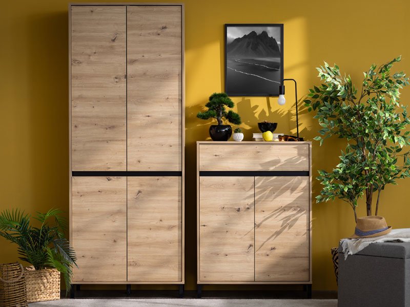 The FLANNAN 2K1F2V shoe cabinet, in artisan oak finish with black matte foil details, is a modern and functional solution for shoe storage that fits even in smaller hall units and suits any home decor style. What sets this hall unit model apart is its functionality. It features a practical closed section for shoe storage, consisting of a double-door closed section with shelves, as well as a spacious drawer.