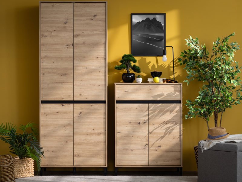 The FLANNAN 2K4V shoe cabinet, in artisan oak finish with black matte foil details, is a modern and functional solution for shoe storage that fits even in smaller hall units and suits any home decor style. What sets this hall unit model apart is its functionality. It features two double-door closed sections with shelves for shoe storage.