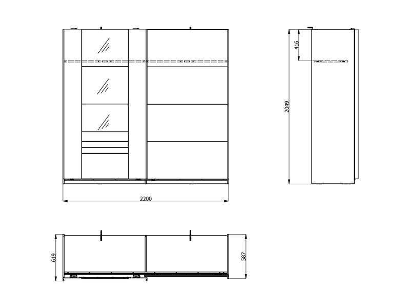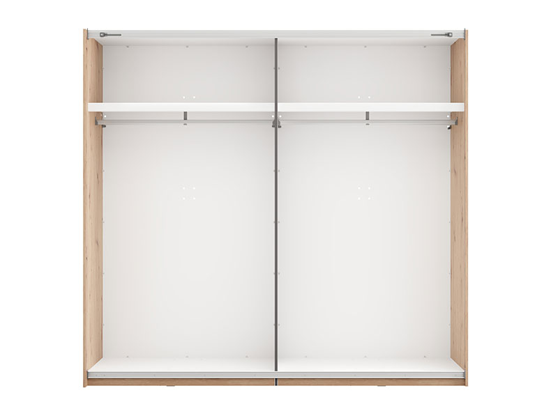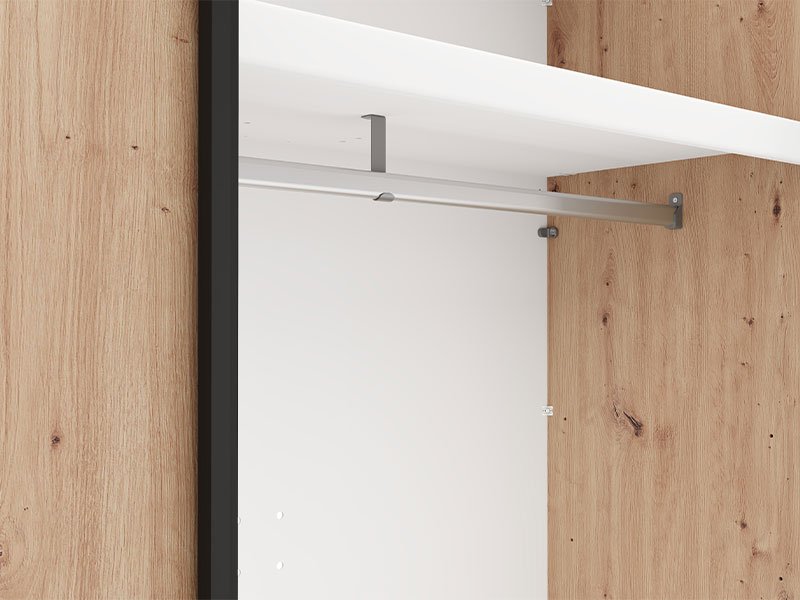 In its basic form, the usable space of the wardrobe consists of two wardrobe rails, which enable tidy and practical storage of clothes. There is a possibility of installing additional shelves, which improves the overview and functionality of the interior space.
