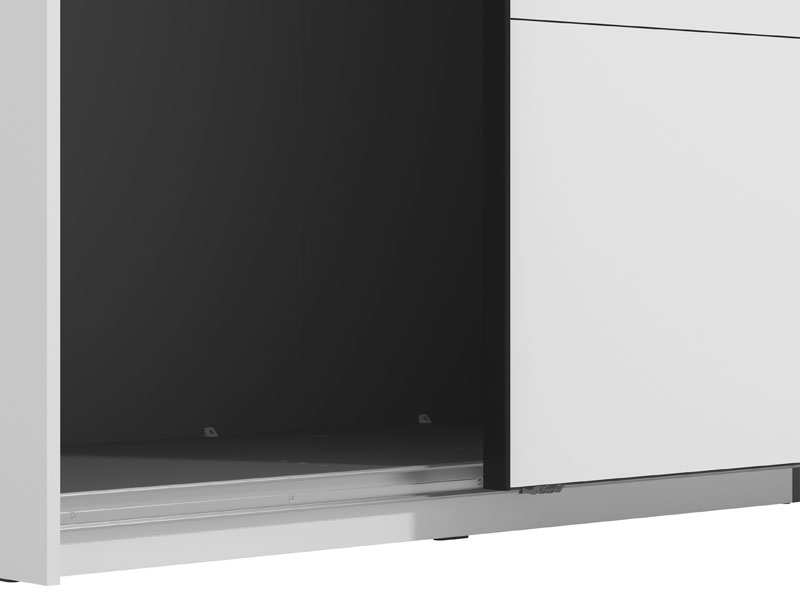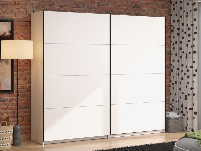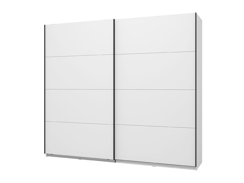GARD 245 h217 Wardrobe with sliding doors, in opaque white finish, contributes to interior functionality, aesthetics, and maximum space utilization. The usable storage space of this model includes hanging rails and one practical shelf on both the left and right sides. It also offers the option to add a Set of shelves suitable for this wardrobe model or verticals and shelves, as well as the option to install sliding door dampers.