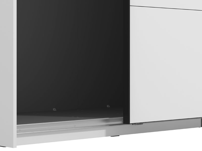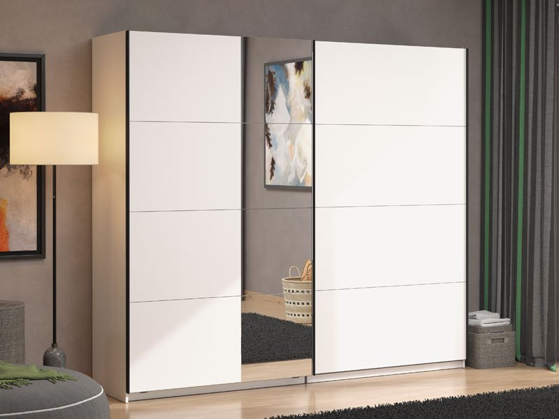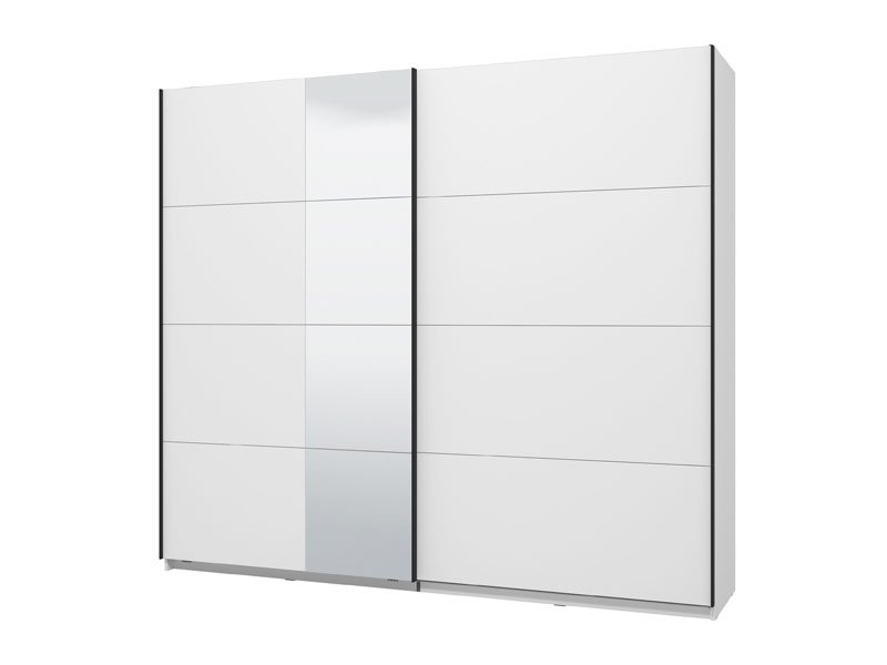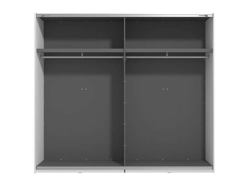 GARD 245 OG h217 Wardrobe with sliding doors, in opaque white finish and a segment with a mirror on the left front, contributes to interior functionality, aesthetics, and maximum space utilization. The usable storage space of this model includes hanging rails and one practical shelf on both the left and right sides. It also offers the option to add a Set of shelves suitable for this wardrobe model or other functional upgrades, as well as the option to install sliding door dampers.