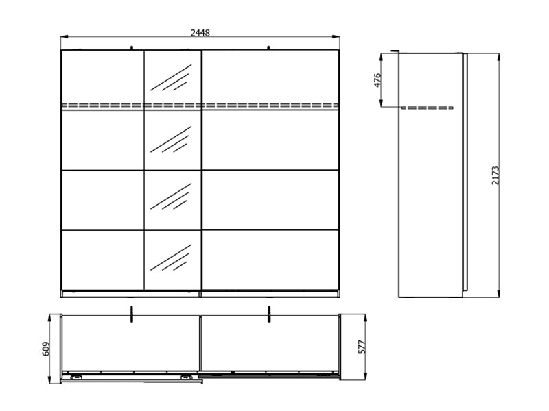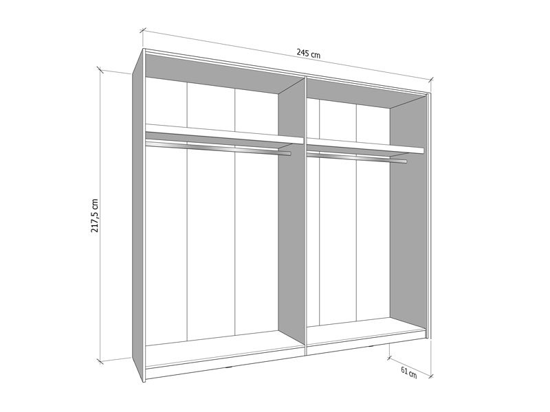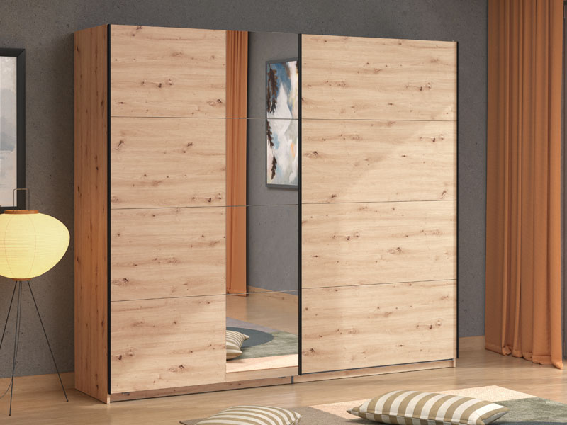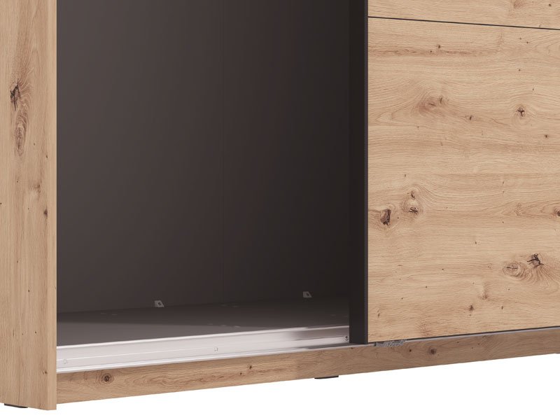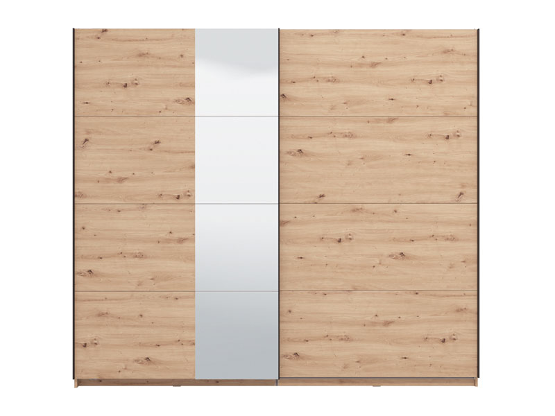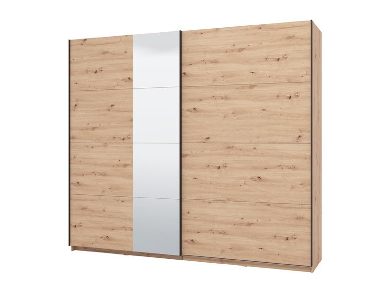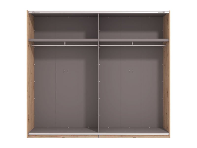 GARD 245 OG h217 Wardrobe with sliding doors, in artisan oak finish and a segment with a mirror on the left front, contributes to interior functionality, aesthetics, and maximum space utilization. The usable storage space of this model includes hanging rails and one practical shelf on both the left and right sides. It also offers the option to add a Set of shelves suitable for this wardrobe model or other functional upgrades, as well as the option to install sliding door dampers.