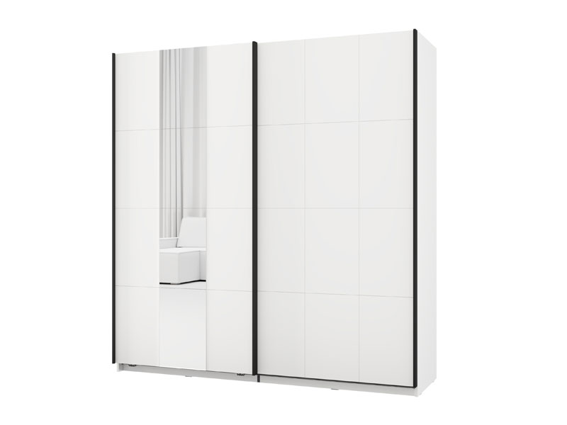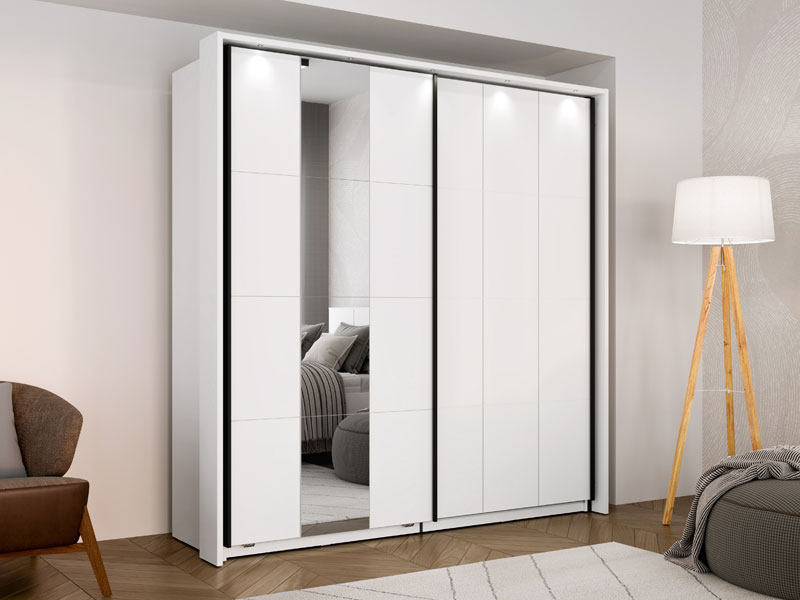Wardrobe SALAMIS 200 OG h205 offers the possibility of installing additional shelves for better space organization, as well as the option of a sliding mechanism retarder for quiet and comfortable use. Also, there is the possibility of adding lighting, which improves the functionality and visual experience of the wardrobe. Wardrobe SALAMIS 200 OG h205 is part of the eponymous bedroom design collection SALAMIS, of a modern and clean design form.