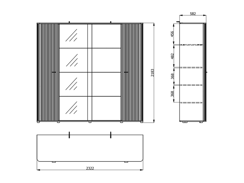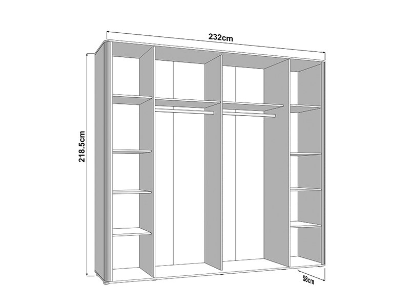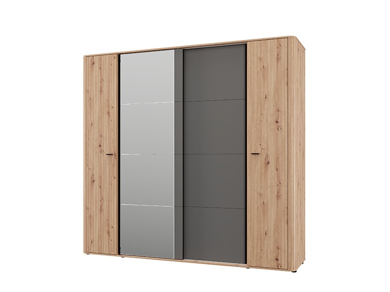 The usable space of the wardrobe consists of two wardrobe rails and two partitions, which allows for a clear and practical disposal of the wardrobe and small items. One of the fronts is equipped with a mirror, which further improves the functionality and visually expands the space.