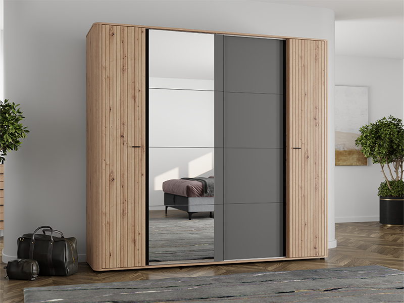 "Wardrobe SINOP 150 KL2K OG h217, made in a combination of artisan oak decor, artisan oak foil, graphite gray and black wood decor, contributes to the modern and sophisticated appearance of the bedroom, emphasizing the contrast and clearly defined geometric design line.