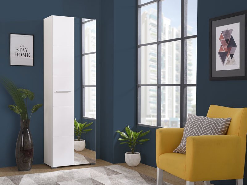 Hall unit element BENY 2K OG, with the white pattern and white lacquer foil, will bring freshness and elegance to your hallway, as well as a practical note thanks to the two-wing part with three shelves and a hanger for storing clothes. It can be combined with the elements of the same name which complete the interior story of the entrance to your home.