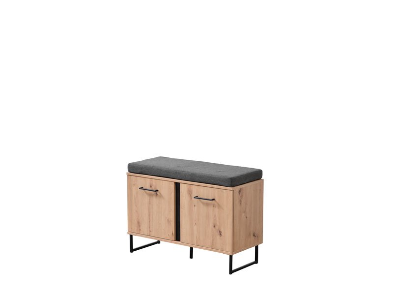 Hall unit element SARDINIA KOM, is a combination of the warmth of natural and rustic artisan oak with admixtures of subtle black elements of decor, as characteristics of industrial style in interior design. It has a practical two-segment closed part for storing shoes and a cushion for the sitting part in a gray pattern. It can be combined with other elements of the SARDINIA hall collection that complete the interior story of the entrance to your home.
