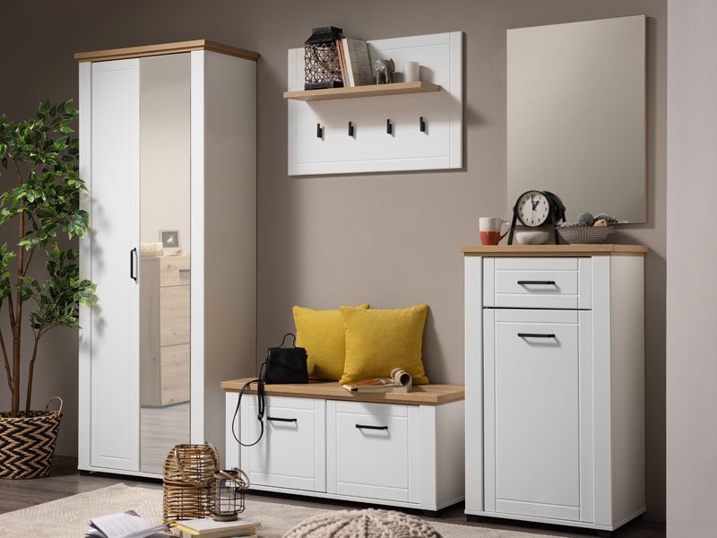 Hall unit element VALENCIA 1K1F in combination with artisan oak, opaque white and white matte foil, is a combination of rustic charm and ambient seriousness, which comes through the right design lines. The fronts are enriched with black handles of simple design, which are in line with the design line. The usable space consists of a drawer and a practical closed segment for storing shoes. It is part of the eponymous system of elements for furnishing the hallway ambience, which is characterized by functionality and practicality to which contributes a large number of elements in the system, as well as excellent organization of storage space.