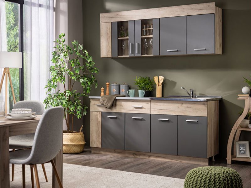 Kitchen LEONA, in grey oak and graphite grey design, is an ideal choice for furnishing rooms of various dimensions. Its design, in line with interior trends, will make the ambiance pleasant and efficiently organized. This model stands out with its semi-glazed hanging elements, contributing to its aesthetics, as well as spacious drawer. Price does not include the sink. Depth with the worktop is 60 cm.