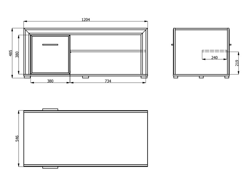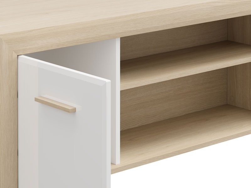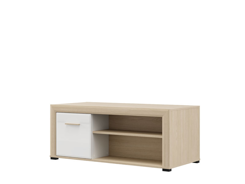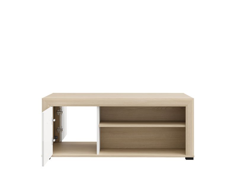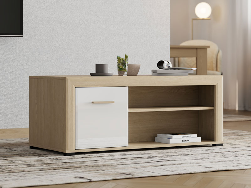 Club table CARLOW is a practical and aesthetically pleasing addition to the living room. The combination of opaque white decor, light port oak, white high gloss foil and light port oak foil brings functionality, warmth and modern aesthetics to the space. The usable space consists of a partition with double-sided closing, as well as a partition shelf under the worktop, which allows convenient disposal of items. Club table CARLOW is part of the living room design system of elements CARLOW and contributes to a harmonious and attractive styling of the home ambience.