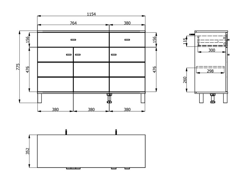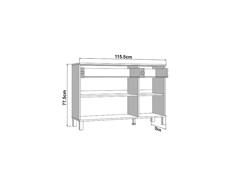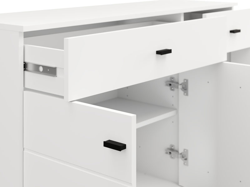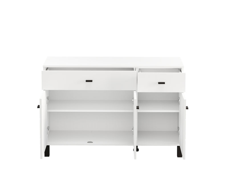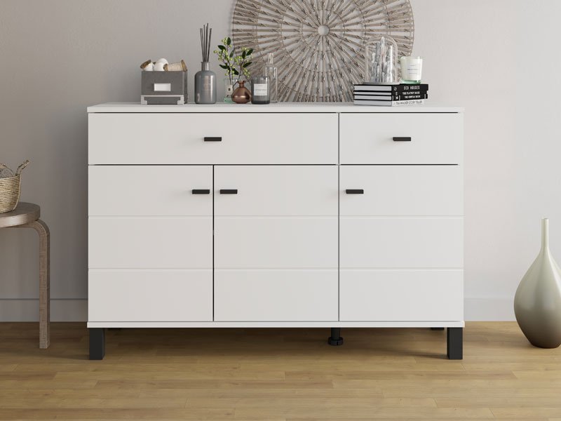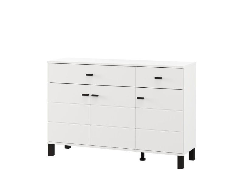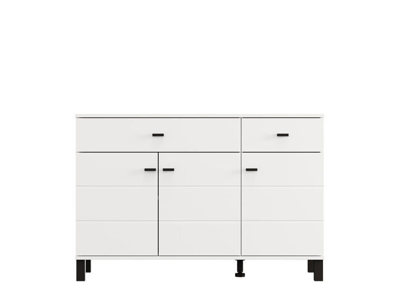 Cabinet ALMOND 115 3K2F3V, in an opaque white decor, features a reduced design and a practical arrangement of elements. Its usable space consists of three closed partitions, as well as two drawers located under the upper surface – one spacious one intended for the disposal of larger items and a smaller one for trinkets. Thanks to its functionality and neutral aesthetics, the ALMOND 115 3K2F3V is a good choice for furnishing a living area, bedroom or hall.