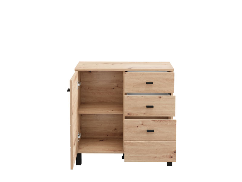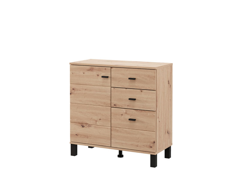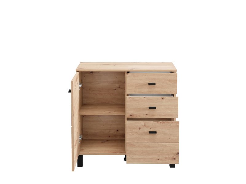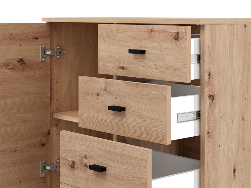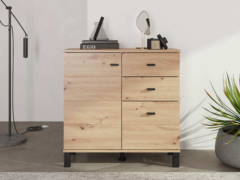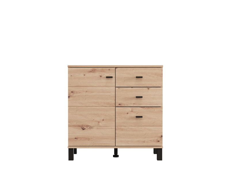 Cabinet ALMOND 77 2K3F1V, in artisan oak decor, brings warmth and a pleasant atmosphere to the space, with a compact form and functional arrangement of elements. The form composed of two wings provides a clearly organized usable space consisting of one closed partition, as well as three drawers – two shallower ones intended for small items and one deeper one for storing larger items. Thanks to the practicality and natural aesthetics of wood decor, cabinet ALMOND 77 2K3F1V is an ideal choice for a hall, bedroom or small living area.