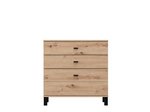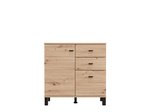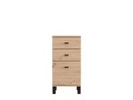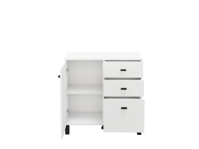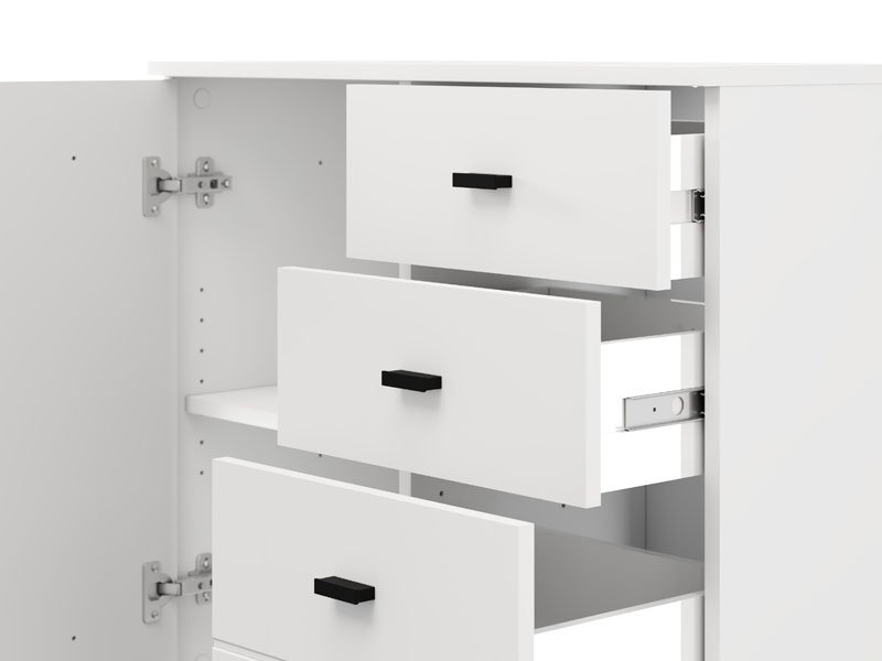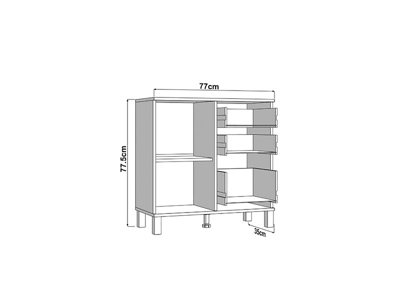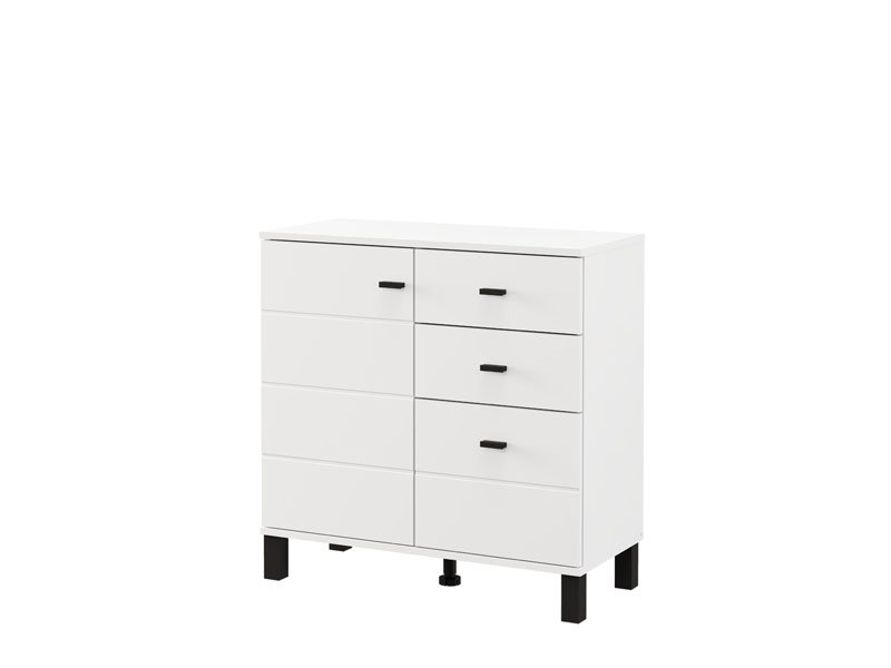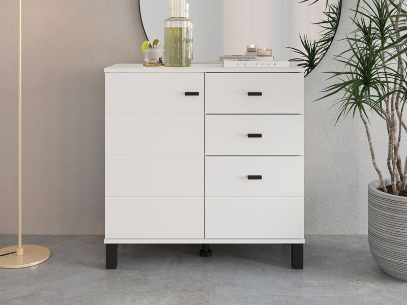 Cabinet ALMOND 77 2K3F1V, in an opaque white decor, features compact dimensions and a functional arrangement of elements. The form composed of two wings provides a clearly organized usable space consisting of one closed partition, as well as three drawers – two shallower ones intended for small items and one deeper one for storing larger items. Thanks to its neutral aesthetics and practicality, cabinet ALMOND 77 2K3F1V is a suitable choice for an entrance hall, bedroom or smaller living area.