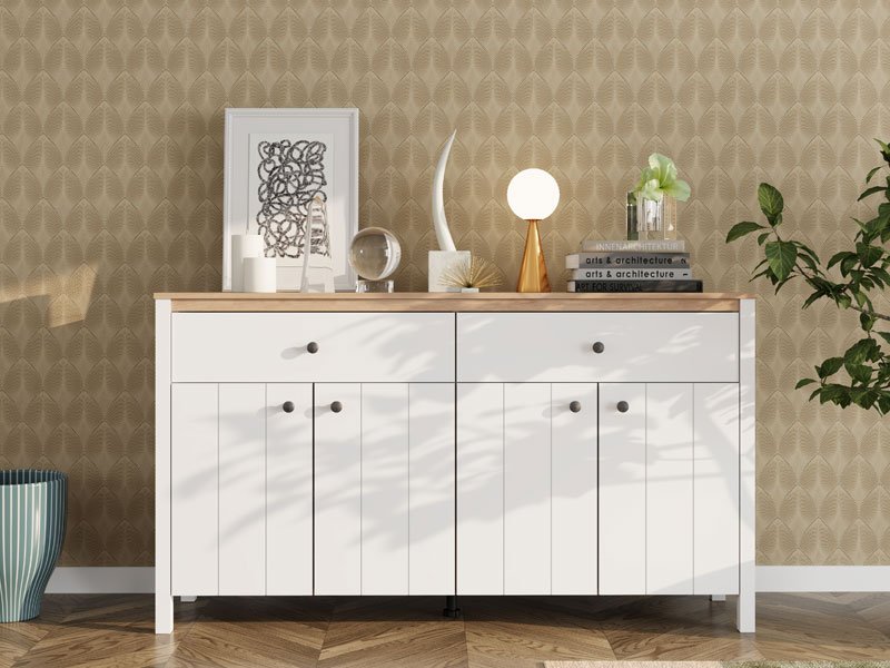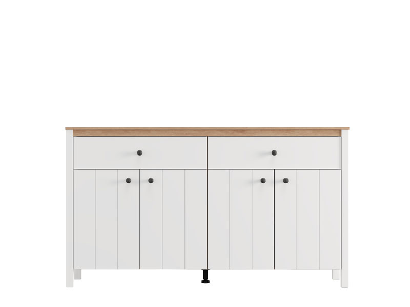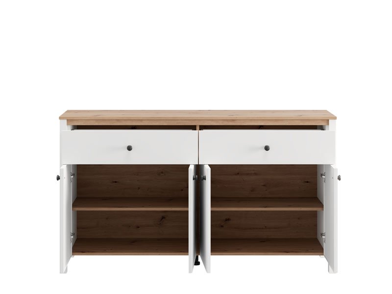 Cabinet BEDFORD 162 4K2F2V combines opaque white decor, artisan oak, white matte foil and artisan oak foil to bring warmth, elegance and natural charm to the space. The usable space consists of two double-winged closed partitions and two spacious drawers, which enable practical and organized disposal of various items, from trinkets to decorative details. Cabinet BEDFORD 162 4K2F2V is part of the system of elements BEDFORD, which features a blend of rustic aesthetics and functional, modern design.