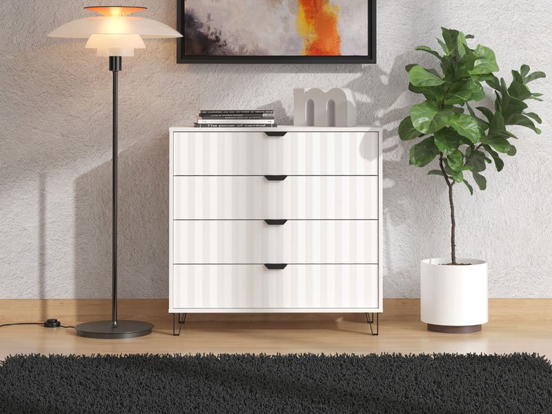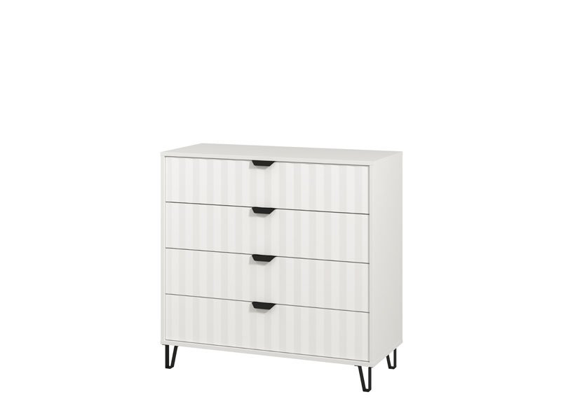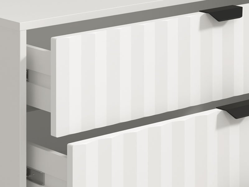 Cabinet BREST 4F, in a combination of opaque white décor and white matte foil, is designed so that, thanks to the usable space provided by four spacious drawers, it belongs to the elements with high utility value. Cabinet BREST 4F is suitable for furnishing the hallway, living room, children's room or bedroom.