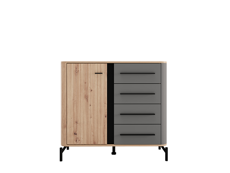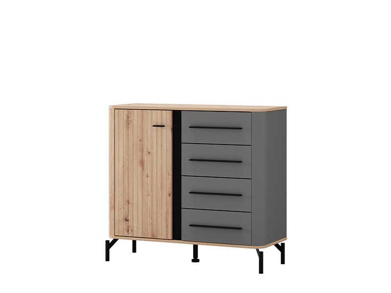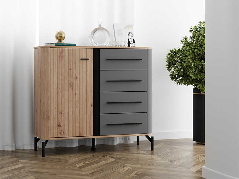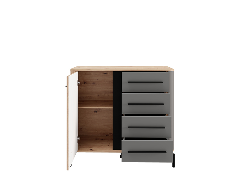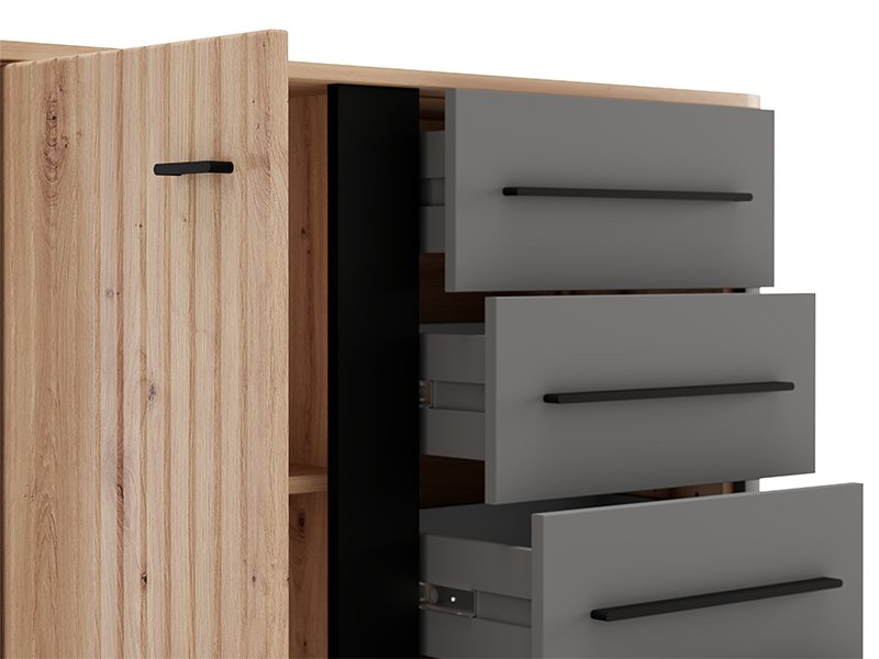 "Cabinet SINOP 103 2K4F1V, made in a combination of decor artisan oak, artisan oak foil, graphite gray and black wood decor, contributes to the modern and elegant look of the bedroom, emphasizing the contrast and clearly defined geometric design line.