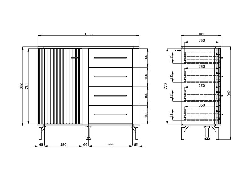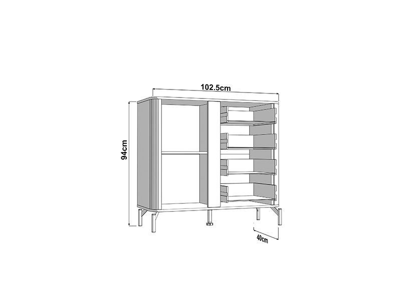The usable space of the cabinet consists of a closed partition and four drawers, which enable a tidy and practical disposal of the wardrobe and other items, thus improving the functionality and organization of the space.