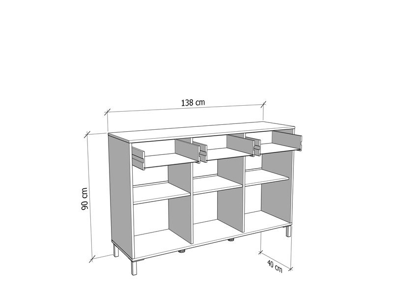 The well-arranged usable space of this cabinet consists of three closed partitions and three practical drawers.