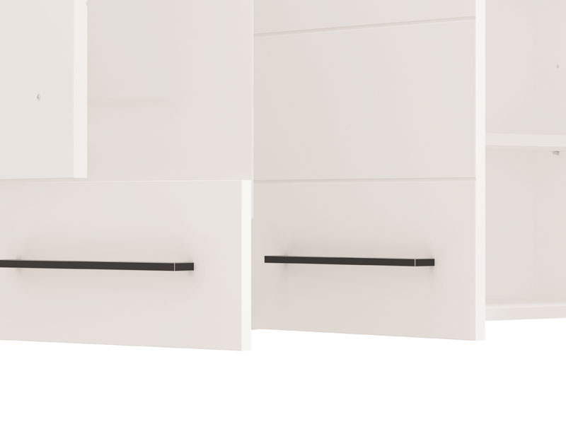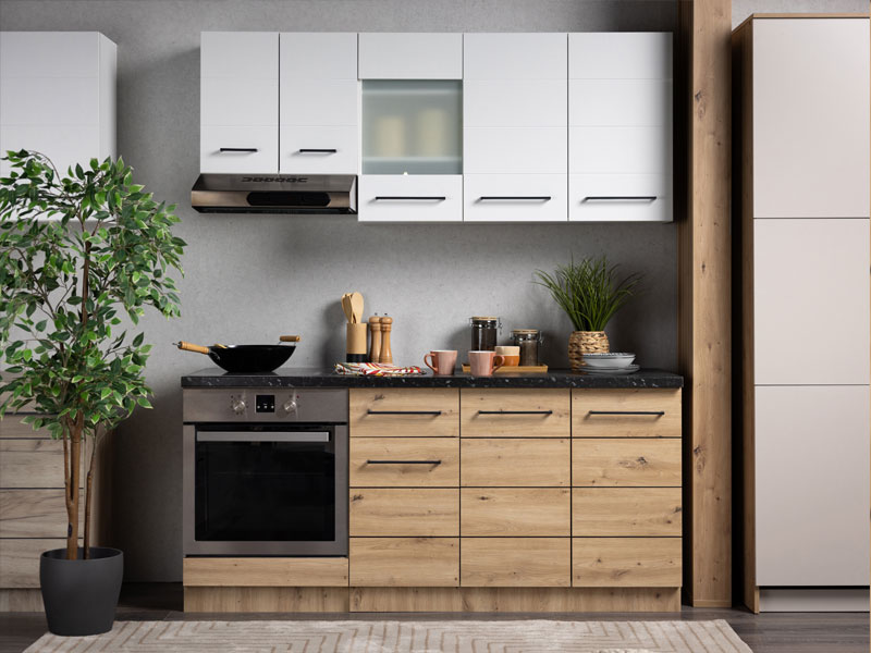 The SAVONA 180 kitchen in opaque white and artisan oak finish is the ideal choice for furnishing rooms of various dimensions. Its pattern, which is in line with interior design trends, will make the ambience pleasant and practically organized. This kitchen model has a well-organized, functional usable space. The upper compartments include a space for a built-in exhaust hood, while the lower kitchen compartments feature a unit for a built-in oven. The presented kitchen model is without a sink and worktop.